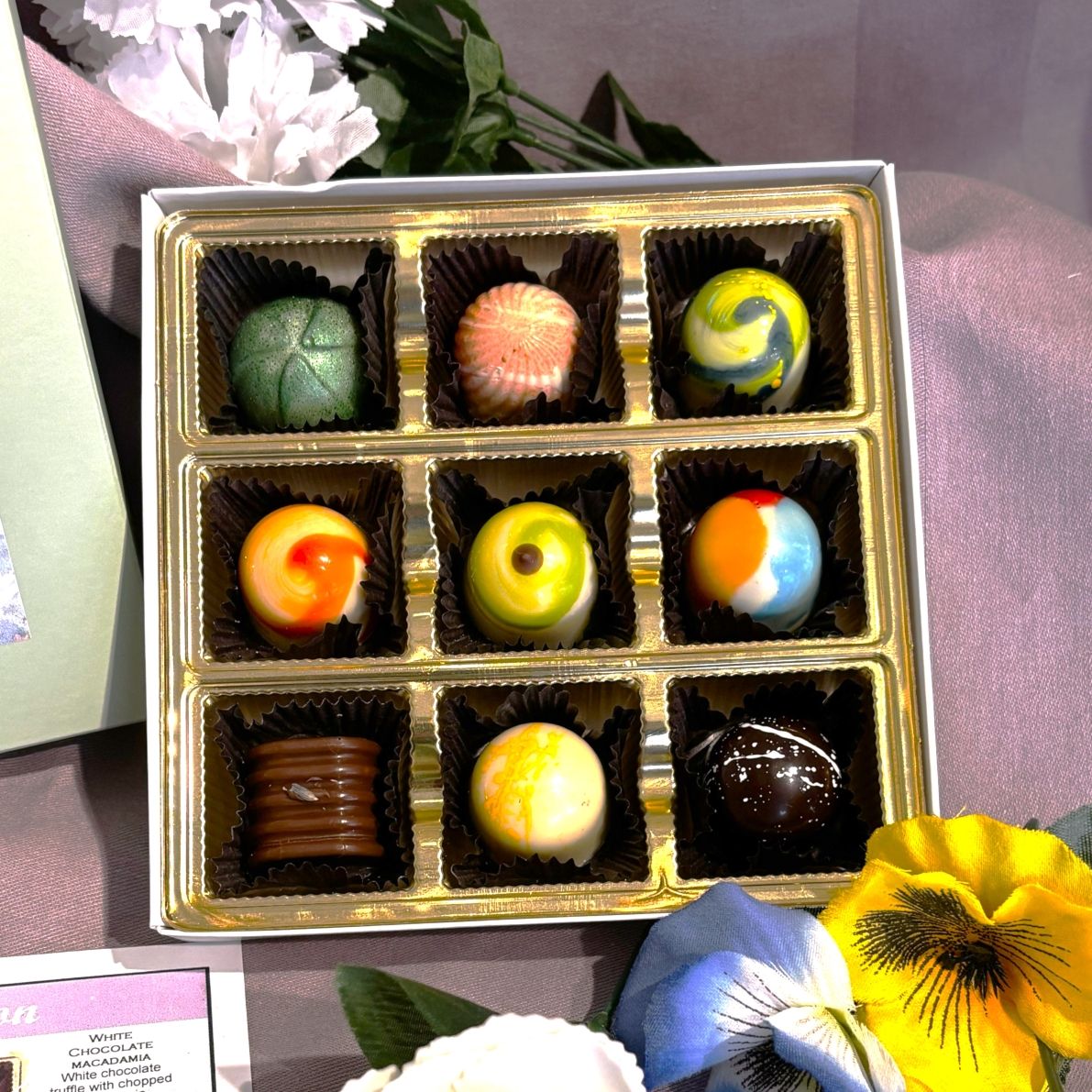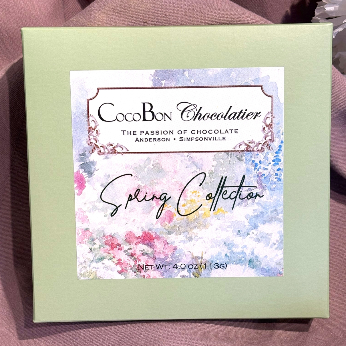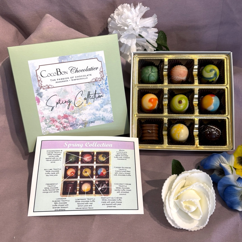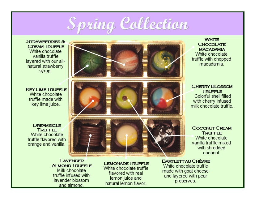 Spring means new beginnings. It offers the bursting aromas of the garden flowers and fresh Spring fruits. We’ve put together some of the best flavors of Spring to create this custom nine-piece collection just for you. We had a little fun with flavors and decorations, too. It’s a real “Must try” offering you won’t want to miss. When Spring is over, this collection will be gone!